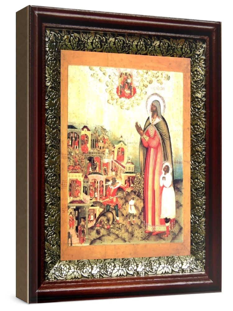 Икона кирик и иулитта (19х22), темный киот. Лик нанесен методом шелкографии на цельную липовую доску, покрытую левкасом (специальным грунтом под живопись). Использованы минеральные (природные) краски. Размер иконы без киота (см): 13х16, с киотом: 19х22. Киот со стеклом, выполнен из березы и украшен басмой (узор из черненой меди в виде виноградной лозы). Икона освящена.