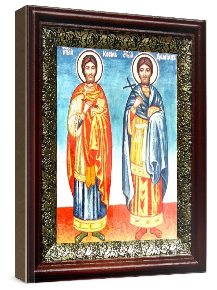 Икона косьма и дамиан (19х22), темный киот. Лик нанесен методом шелкографии на цельную липовую доску, покрытую левкасом (специальным грунтом под живопись). Использованы минеральные (природные) краски. Размер иконы без киота (см): 13х16, с киотом: 19х22. Киот со стеклом, выполнен из березы и украшен басмой (узор из черненой меди в виде виноградной лозы). Икона освящена.