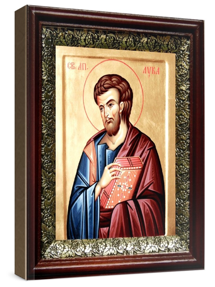 Икона лука, апостол (19х22), темный киот. Лик нанесен методом шелкографии на цельную липовую доску, покрытую левкасом (специальным грунтом под живопись). Использованы минеральные (природные) краски. Размер иконы без киота (см): 13х16, с киотом: 19х22. Киот со стеклом, выполнен из березы и украшен басмой (узор из черненой меди в виде виноградной лозы). Икона освящена.