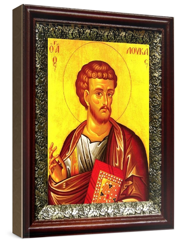 Икона лука, апостол (19х22), темный киот. Лик нанесен методом шелкографии на цельную липовую доску, покрытую левкасом (специальным грунтом под живопись). Использованы минеральные (природные) краски. Размер иконы без киота (см): 13х16, с киотом: 19х22. Киот со стеклом, выполнен из березы и украшен басмой (узор из черненой меди в виде виноградной лозы). Икона освящена.