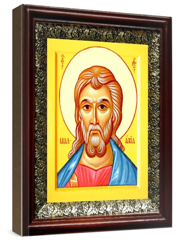 Икона малахия, пророк (19х22), темный киот. Лик нанесен методом шелкографии на цельную липовую доску, покрытую левкасом (специальным грунтом под живопись). Использованы минеральные (природные) краски. Размер иконы без киота (см): 13х16, с киотом: 19х22. Киот со стеклом, выполнен из березы и украшен басмой (узор из черненой меди в виде виноградной лозы). Икона освящена.
