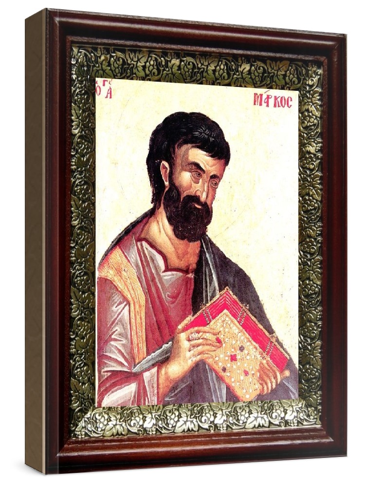 Икона марк, апостол (19х22), темный киот. Лик нанесен методом шелкографии на цельную липовую доску, покрытую левкасом (специальным грунтом под живопись). Использованы минеральные (природные) краски. Размер иконы без киота (см): 13х16, с киотом: 19х22. Киот со стеклом, выполнен из березы и украшен басмой (узор из черненой меди в виде виноградной лозы). Икона освящена.