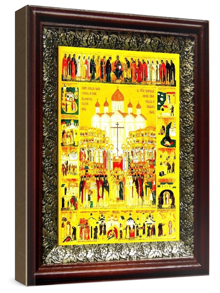 Икона российские новомученики (19х22), темный киот. Лик нанесен методом шелкографии на цельную липовую доску, покрытую левкасом (специальным грунтом под живопись). Использованы минеральные (природные) краски. Размер иконы без киота (см): 13х16, с киотом: 19х22. Киот со стеклом, выполнен из березы и украшен басмой (узор из черненой меди в виде виноградной лозы). Икона освящена.