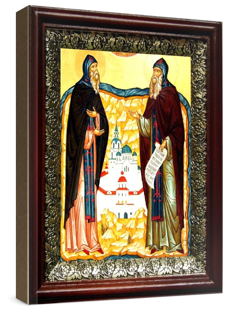 Икона сергий и герман валаамские (19х22), темный киот. Лик нанесен методом шелкографии на цельную липовую доску, покрытую левкасом (специальным грунтом под живопись). Использованы минеральные (природные) краски. Размер иконы без киота (см): 13х16, с киотом: 19х22. Киот со стеклом, выполнен из березы и украшен басмой (узор из черненой меди в виде виноградной лозы). Икона освящена.