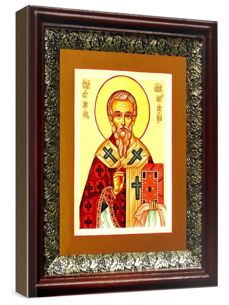 Икона симеон иерусалимский (19х22), темный киот. Лик нанесен методом шелкографии на цельную липовую доску, покрытую левкасом (специальным грунтом под живопись). Использованы минеральные (природные) краски. Размер иконы без киота (см): 13х16, с киотом: 19х22. Киот со стеклом, выполнен из березы и украшен басмой (узор из черненой меди в виде виноградной лозы). Икона освящена.