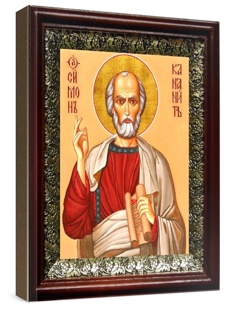 Икона симон кананит (зилот) (19х22), темный киот. Лик нанесен методом шелкографии на цельную липовую доску, покрытую левкасом (специальным грунтом под живопись). Использованы минеральные (природные) краски. Размер иконы без киота (см): 13х16, с киотом: 19х22. Киот со стеклом, выполнен из березы и украшен басмой (узор из черненой меди в виде виноградной лозы). Икона освящена.