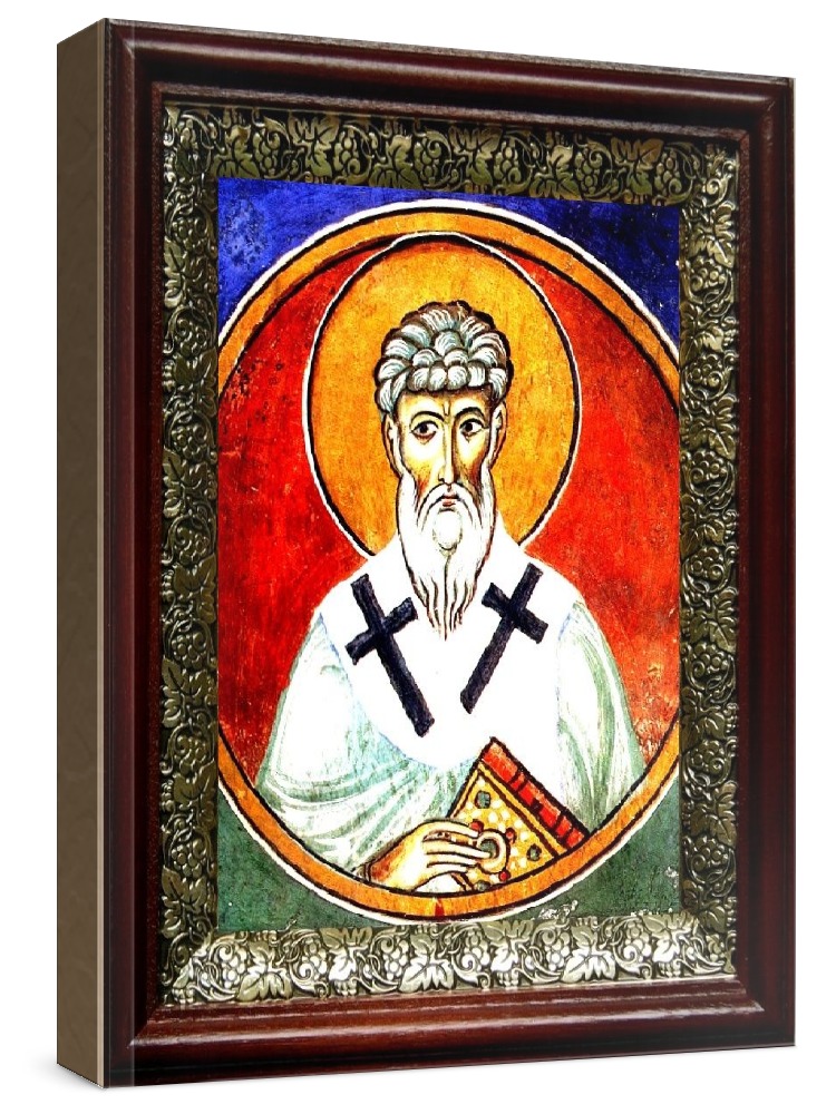 Икона трифиллий левкусийский (19х22), темный киот. Лик нанесен методом шелкографии на цельную липовую доску, покрытую левкасом (специальным грунтом под живопись). Использованы минеральные (природные) краски. Размер иконы без киота (см): 13х16, с киотом: 19х22. Киот со стеклом, выполнен из березы и украшен басмой (узор из черненой меди в виде виноградной лозы). Икона освящена.