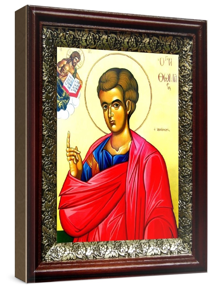 Икона фома дидим (близнец) (19х22), темный киот. Лик нанесен методом шелкографии на цельную липовую доску, покрытую левкасом (специальным грунтом под живопись). Использованы минеральные (природные) краски. Размер иконы без киота (см): 13х16, с киотом: 19х22. Киот со стеклом, выполнен из березы и украшен басмой (узор из черненой меди в виде виноградной лозы). Икона освящена.