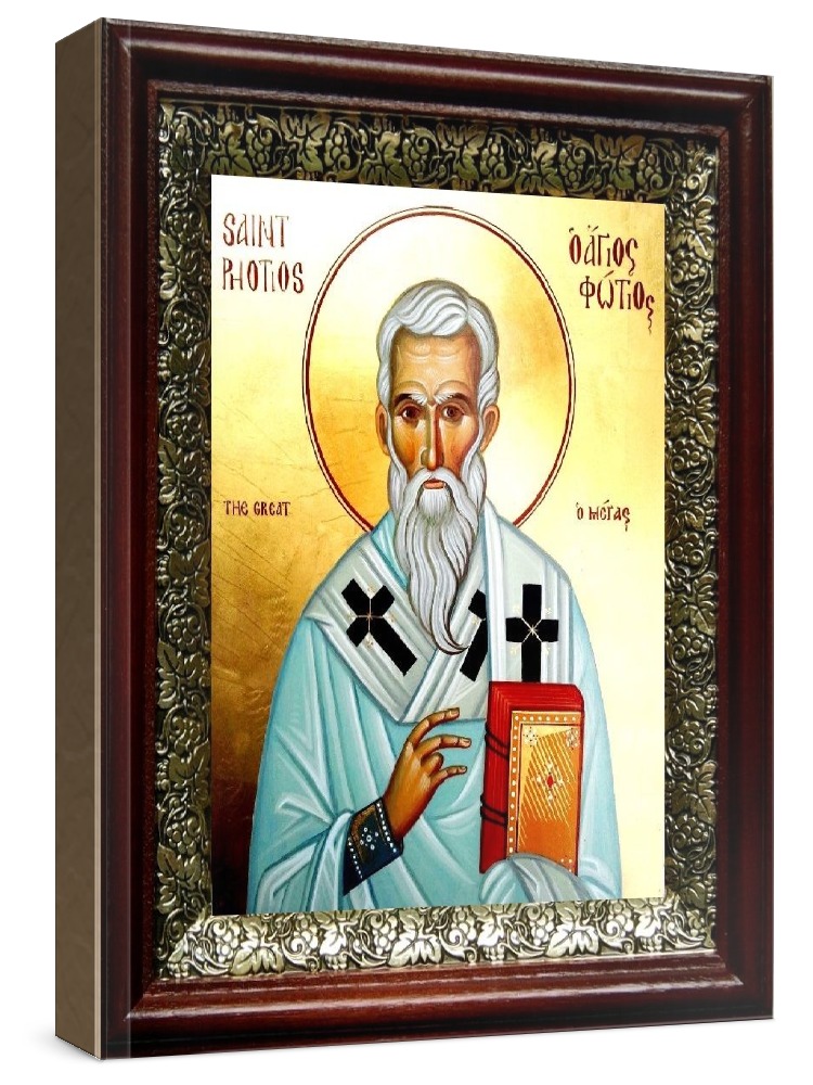 Икона фотий константинопольский (19х22), темный киот. Лик нанесен методом шелкографии на цельную липовую доску, покрытую левкасом (специальным грунтом под живопись). Использованы минеральные (природные) краски. Размер иконы без киота (см): 13х16, с киотом: 19х22. Киот со стеклом, выполнен из березы и украшен басмой (узор из черненой меди в виде виноградной лозы). Икона освящена.