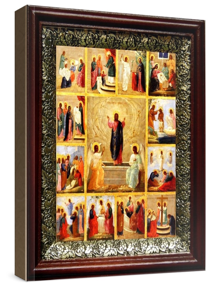 Икона 12 праздников (19х22), темный киот. Лик нанесен методом шелкографии на цельную липовую доску, покрытую левкасом (специальным грунтом под живопись). Использованы минеральные (природные) краски. Размер иконы без киота (см): 13х16, с киотом: 19х22. Киот со стеклом, выполнен из березы и украшен басмой (узор из черненой меди в виде виноградной лозы). Икона освящена.