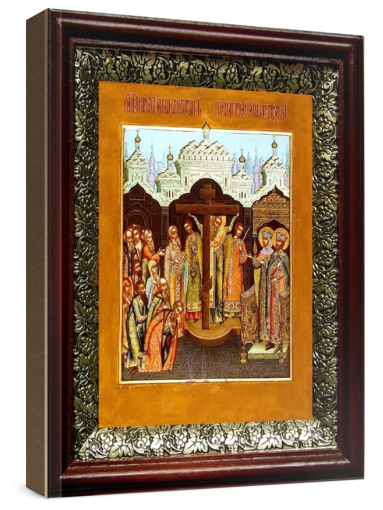 Икона воздвижение креста господня (19х22), темный киот. Лик нанесен методом шелкографии на цельную липовую доску, покрытую левкасом (специальным грунтом под живопись). Использованы минеральные (природные) краски. Размер иконы без киота (см): 13х16, с киотом: 19х22. Киот со стеклом, выполнен из березы и украшен басмой (узор из черненой меди в виде виноградной лозы). Икона освящена.