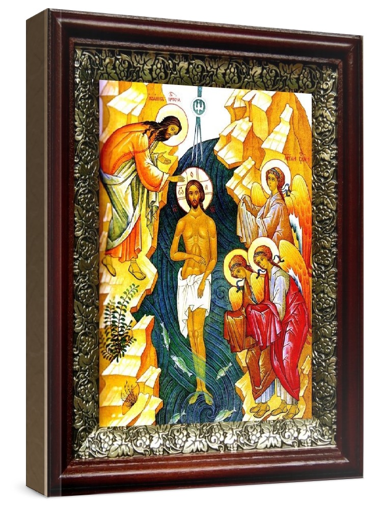 Икона крещение господне (19х22), темный киот. Лик нанесен методом шелкографии на цельную липовую доску, покрытую левкасом (специальным грунтом под живопись). Использованы минеральные (природные) краски. Размер иконы без киота (см): 13х16, с киотом: 19х22. Киот со стеклом, выполнен из березы и украшен басмой (узор из черненой меди в виде виноградной лозы). Икона освящена.