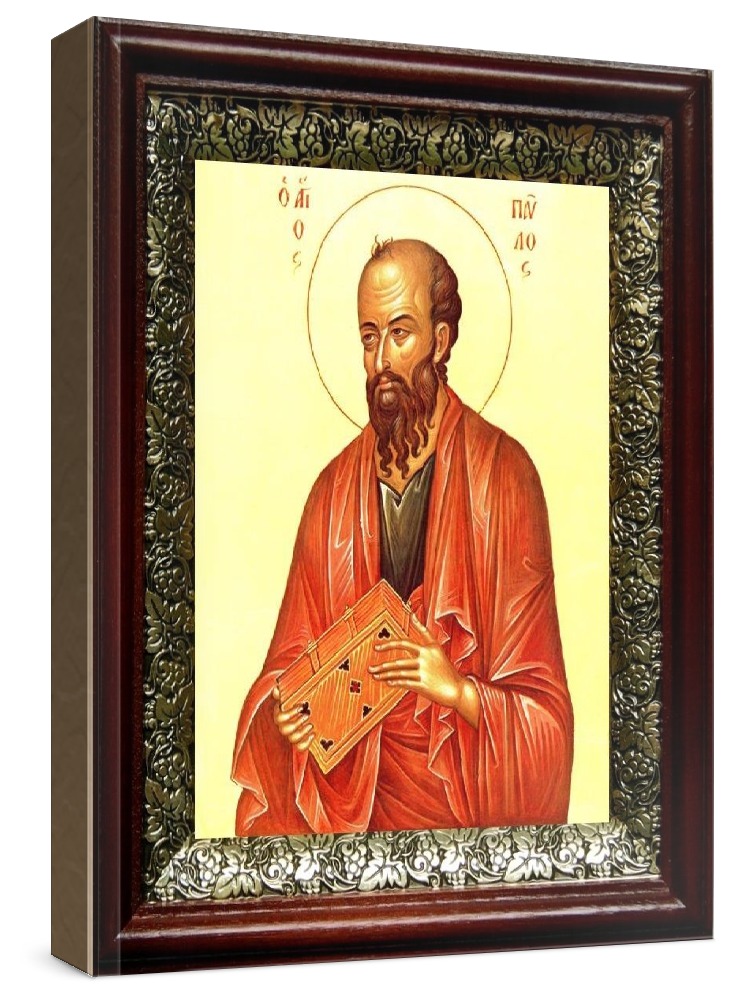 Икона павел, апостол (19х22), темный киот. Лик нанесен методом шелкографии на цельную липовую доску, покрытую левкасом (специальным грунтом под живопись). Использованы минеральные (природные) краски. Размер иконы без киота (см): 13х16, с киотом: 19х22. Киот со стеклом, выполнен из березы и украшен басмой (узор из черненой меди в виде виноградной лозы). Икона освящена.