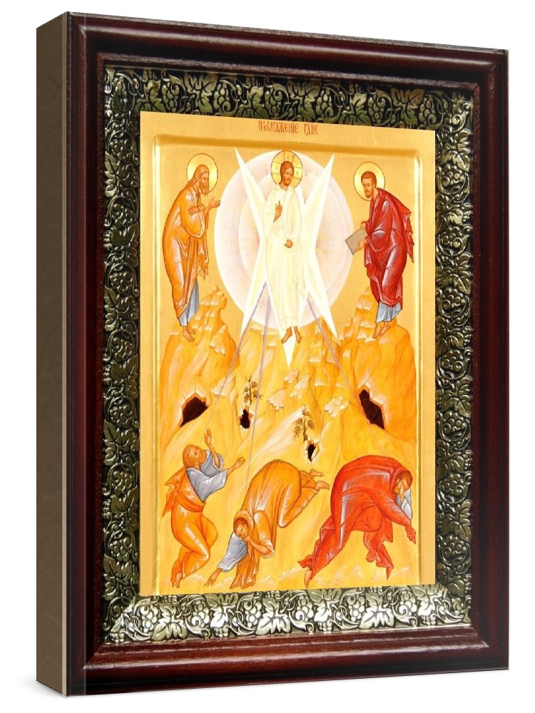 Икона преображение господне (19х22), темный киот. Лик нанесен методом шелкографии на цельную липовую доску, покрытую левкасом (специальным грунтом под живопись). Использованы минеральные (природные) краски. Размер иконы без киота (см): 13х16, с киотом: 19х22. Киот со стеклом, выполнен из березы и украшен басмой (узор из черненой меди в виде виноградной лозы). Икона освящена.