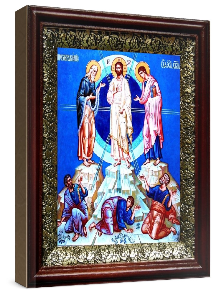 Икона преображение господне (19х22), темный киот. Лик нанесен методом шелкографии на цельную липовую доску, покрытую левкасом (специальным грунтом под живопись). Использованы минеральные (природные) краски. Размер иконы без киота (см): 13х16, с киотом: 19х22. Киот со стеклом, выполнен из березы и украшен басмой (узор из черненой меди в виде виноградной лозы). Икона освящена.