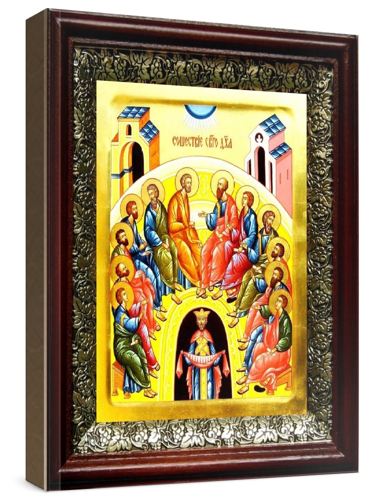 Икона сошествие святого духа на апостолов (19х22), темный киот. Лик нанесен методом шелкографии на цельную липовую доску, покрытую левкасом (специальным грунтом под живопись). Использованы минеральные (природные) краски. Размер иконы без киота (см): 13х16, с киотом: 19х22. Киот со стеклом, выполнен из березы и украшен басмой (узор из черненой меди в виде виноградной лозы). Икона освящена.
