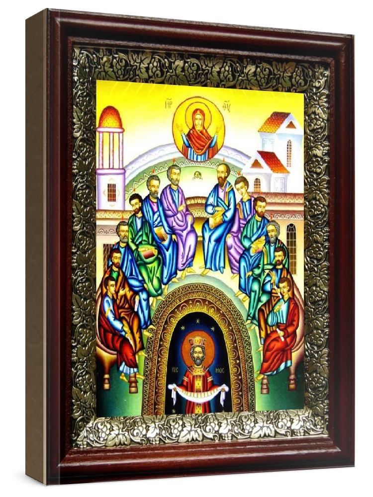 Икона сошествие святого духа на апостолов (19х22), темный киот. Лик нанесен методом шелкографии на цельную липовую доску, покрытую левкасом (специальным грунтом под живопись). Использованы минеральные (природные) краски. Размер иконы без киота (см): 13х16, с киотом: 19х22. Киот со стеклом, выполнен из березы и украшен басмой (узор из черненой меди в виде виноградной лозы). Икона освящена.