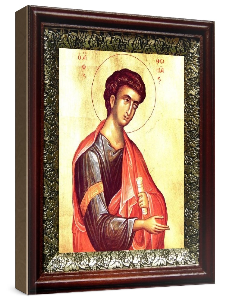 Икона фома, апостол (19х22), темный киот. Лик нанесен методом шелкографии на цельную липовую доску, покрытую левкасом (специальным грунтом под живопись). Использованы минеральные (природные) краски. Размер иконы без киота (см): 13х16, с киотом: 19х22. Киот со стеклом, выполнен из березы и украшен басмой (узор из черненой меди в виде виноградной лозы). Икона освящена.