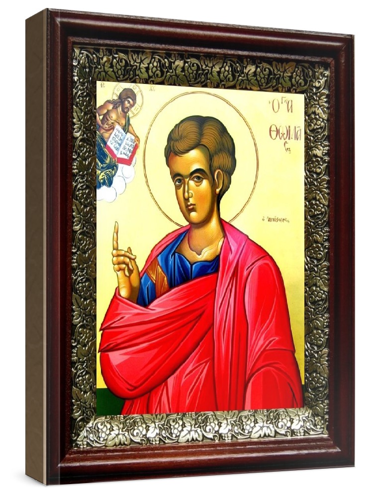 Икона фома, апостол (19х22), темный киот. Лик нанесен методом шелкографии на цельную липовую доску, покрытую левкасом (специальным грунтом под живопись). Использованы минеральные (природные) краски. Размер иконы без киота (см): 13х16, с киотом: 19х22. Киот со стеклом, выполнен из березы и украшен басмой (узор из черненой меди в виде виноградной лозы). Икона освящена.