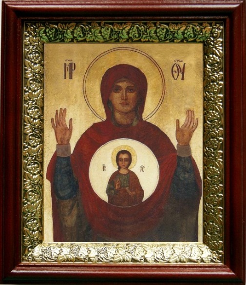 Икона знамение (19х22), темный киот. Лик нанесен методом шелкографии на цельную липовую доску, покрытую левкасом (специальным грунтом под живопись). Использованы минеральные (природные) краски. Размер иконы без киота (см): 13х16, с киотом: 19х22. Киот (рамка) выполнен из березы и украшен басмой (узор из черненой меди в виде виноградной лозы). Икона освящена.