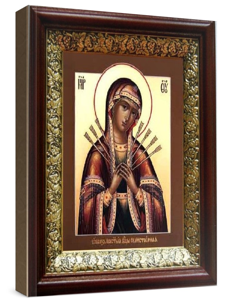 Семистрельная икона бм (19х22), темный киот. Лик нанесен методом шелкографии на цельную липовую доску, покрытую левкасом (специальным грунтом под живопись). Использованы минеральные (природные) краски. Размер иконы без киота (см): 13х16, с киотом: 19х22. Киот (рамка) выполнен из березы и украшен басмой (узор из черненой меди в виде виноградной лозы). Икона освящена.