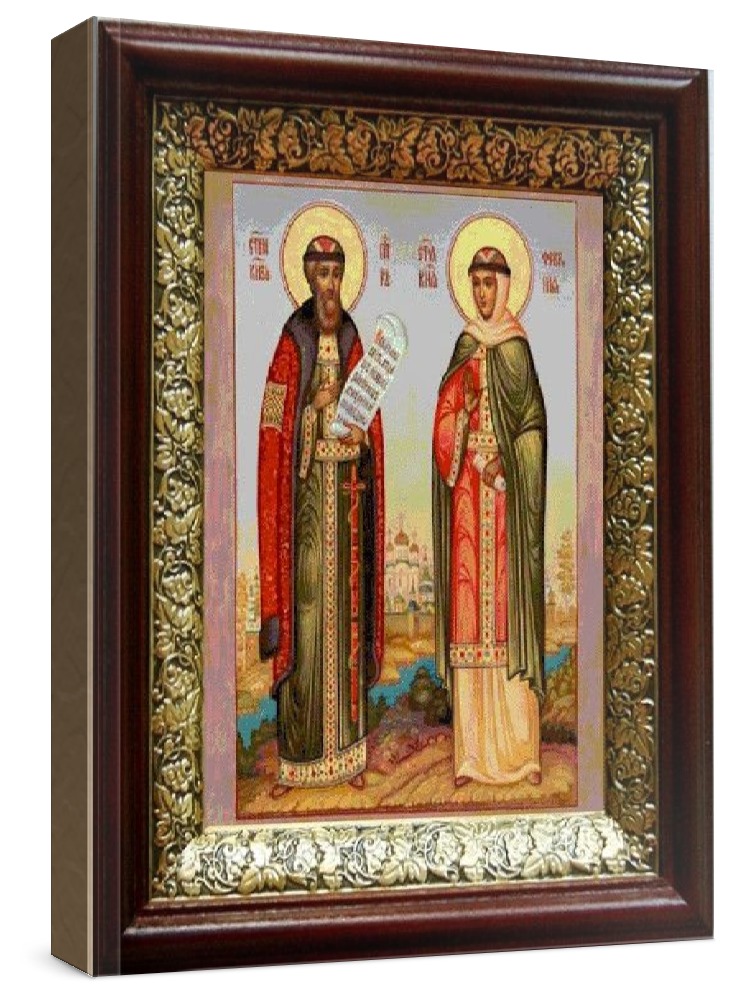 Икона петр и феврония (19х22), темный киот. Лик нанесен методом шелкографии на цельную липовую доску, покрытую левкасом (специальным грунтом под живопись). Использованы минеральные (природные) краски. Размер иконы без киота (см): 13х16, с киотом: 19х22. Киот (рамка) выполнен из березы и украшен басмой (узор из черненой меди в виде виноградной лозы). Икона освящена.
