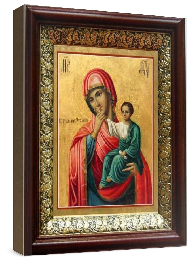 Икона отрада и утешение (19х22), темный киот. Лик нанесен методом шелкографии на цельную липовую доску, покрытую левкасом (специальным грунтом под живопись). Использованы минеральные (природные) краски. Размер иконы без киота (см): 13х16, с киотом: 19х22. Киот (рамка) выполнен из березы и украшен басмой (узор из черненой меди в виде виноградной лозы). Икона освящена.