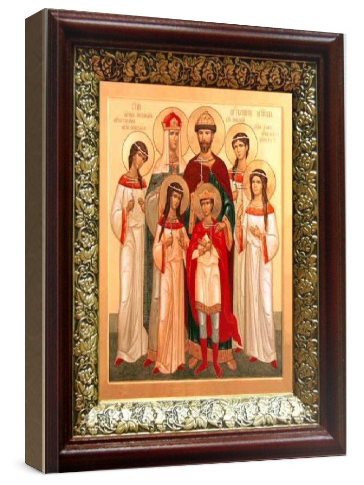 Икона царская семья (19х22), темный киот. Лик нанесен методом шелкографии на цельную липовую доску, покрытую левкасом (специальным грунтом под живопись). Использованы минеральные (природные) краски. Размер иконы без киота (см): 13х16, с киотом: 19х22. Киот (рамка) выполнен из березы и украшен басмой (узор из черненой меди в виде виноградной лозы). Икона освящена.