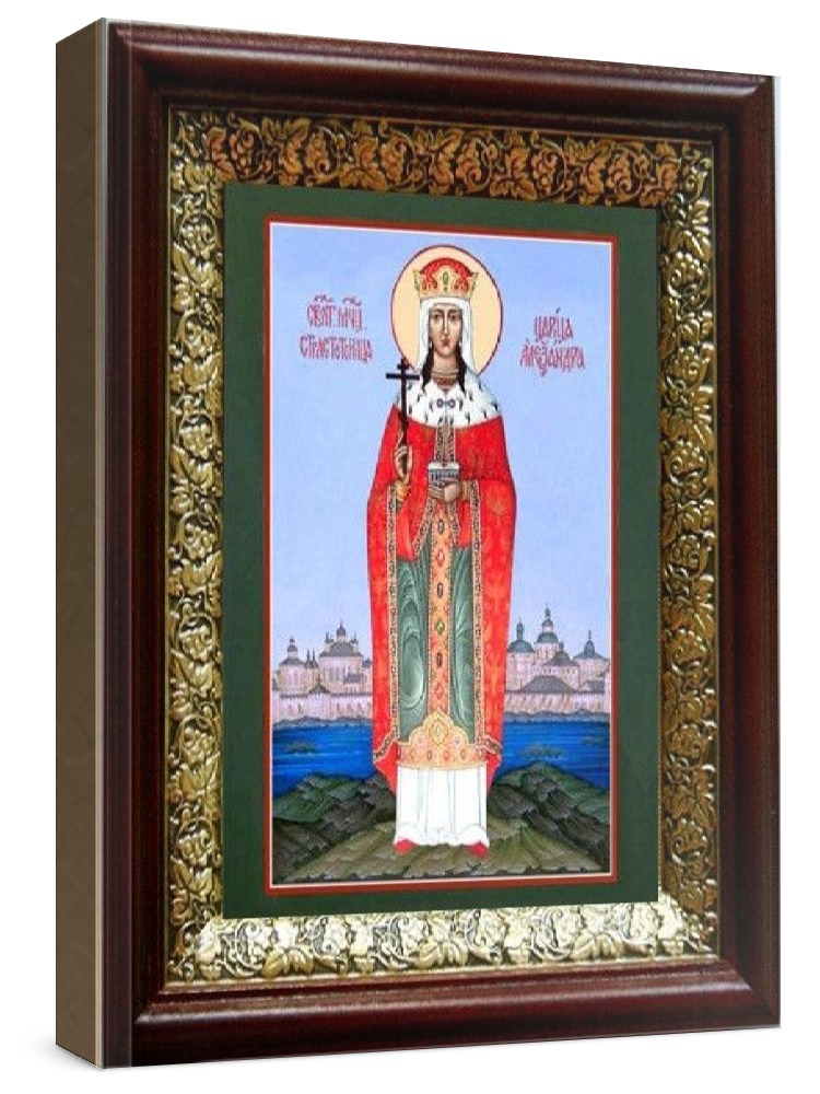Икона александра федоровна романова (19х22), темный киот. Лик нанесен методом шелкографии на цельную липовую доску, покрытую левкасом (специальным грунтом под живопись). Использованы минеральные (природные) краски. Размер иконы без киота (см): 13х16, с киотом: 19х22. Киот (рамка) выполнен из березы и украшен басмой (узор из черненой меди в виде виноградной лозы). Икона освящена.