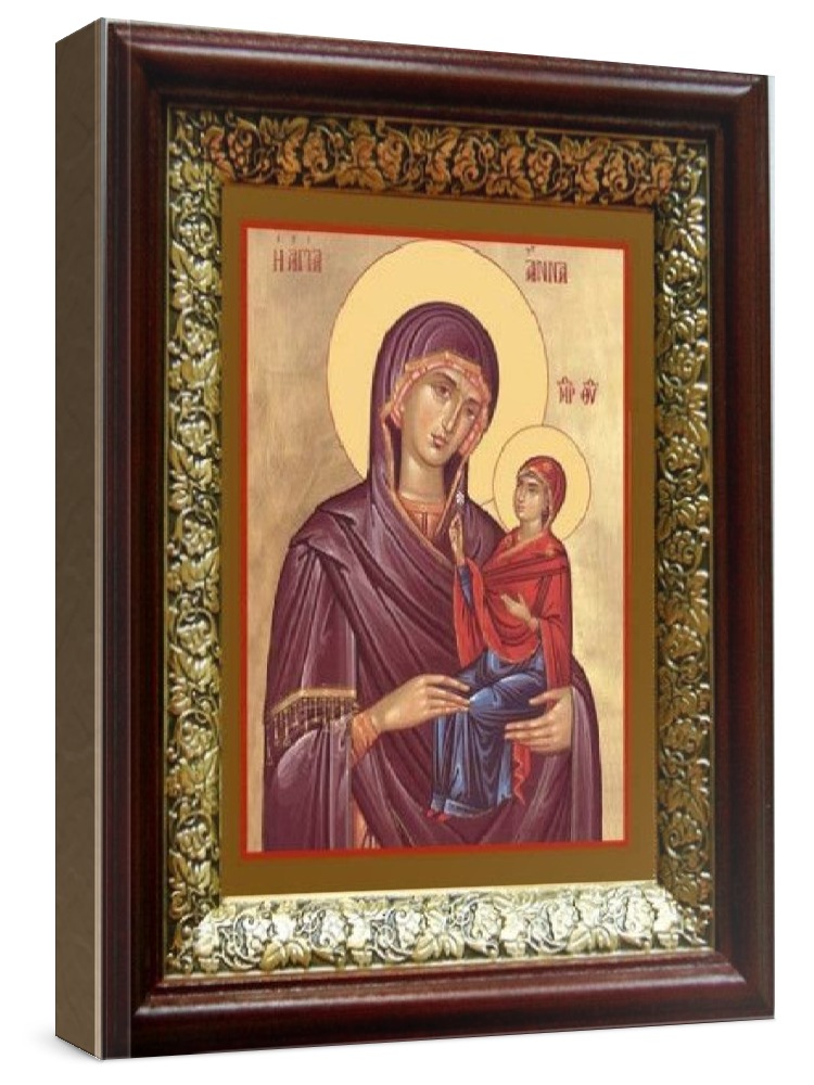 Икона анна праведная, мать богородицы (19х22), темный киот. Лик нанесен методом шелкографии на цельную липовую доску, покрытую левкасом (специальным грунтом под живопись). Использованы минеральные (природные) краски. Размер иконы без киота (см): 13х16, с киотом: 19х22. Киот (рамка) выполнен из березы и украшен басмой (узор из черненой меди в виде виноградной лозы). Икона освящена.