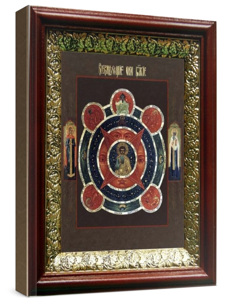 Икона всевидящее око (19х22), темный киот. Лик нанесен методом шелкографии на цельную липовую доску, покрытую левкасом (специальным грунтом под живопись). Использованы минеральные (природные) краски. Размер иконы без киота (см): 13х16, с киотом: 19х22. Киот (рамка) выполнен из березы и украшен басмой (узор из черненой меди в виде виноградной лозы). Икона освящена.