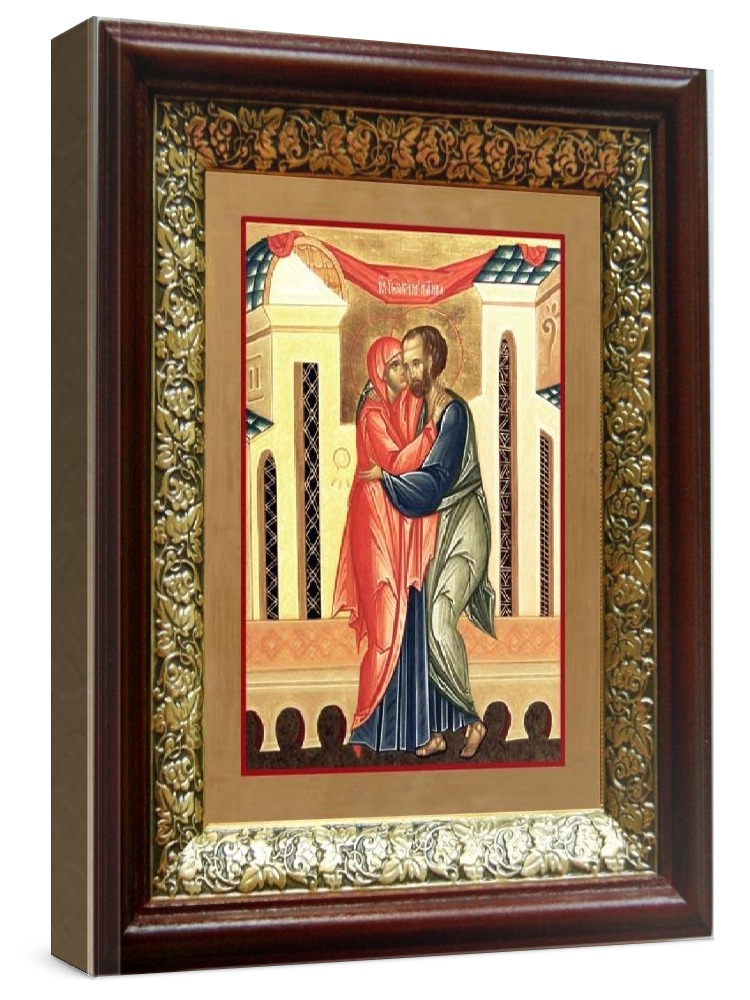 Икона иоаким и анна (19х22), темный киот. Лик нанесен методом шелкографии на цельную липовую доску, покрытую левкасом (специальным грунтом под живопись). Использованы минеральные (природные) краски. Размер иконы без киота (см): 13х16, с киотом: 19х22. Киот (рамка) выполнен из березы и украшен басмой (узор из черненой меди в виде виноградной лозы). Икона освящена.