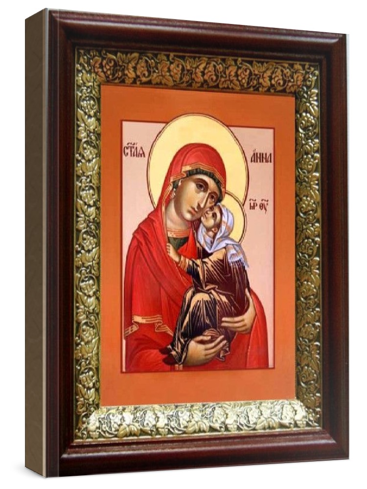 Икона анна праведная, мать богородицы (19х22), темный киот. Лик нанесен методом шелкографии на цельную липовую доску, покрытую левкасом (специальным грунтом под живопись). Использованы минеральные (природные) краски. Размер иконы без киота (см): 13х16, с киотом: 19х22. Киот (рамка) выполнен из березы и украшен басмой (узор из черненой меди в виде виноградной лозы). Икона освящена.
