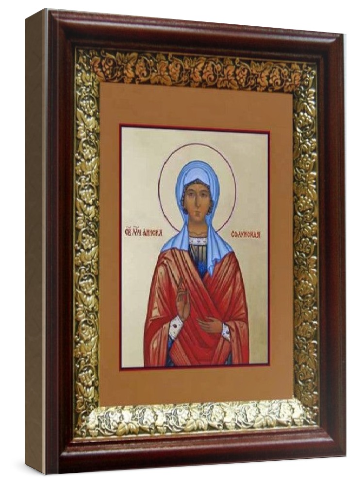 Икона анисия солунская (19х22), темный киот. Лик нанесен методом шелкографии на цельную липовую доску, покрытую левкасом (специальным грунтом под живопись). Использованы минеральные (природные) краски. Размер иконы без киота (см): 13х16, с киотом: 19х22. Киот (рамка) выполнен из березы и украшен басмой (узор из черненой меди в виде виноградной лозы). Икона освящена.