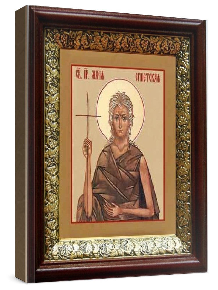 Икона мария египетская (19х22), темный киот. Лик нанесен методом шелкографии на цельную липовую доску, покрытую левкасом (специальным грунтом под живопись). Использованы минеральные (природные) краски. Размер иконы без киота (см): 13х16, с киотом: 19х22. Киот (рамка) выполнен из березы и украшен басмой (узор из черненой меди в виде виноградной лозы). Икона освящена.