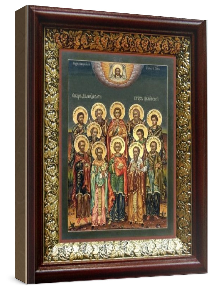 Икона собор 12 целителей (19х22), темный киот. Лик нанесен методом шелкографии на цельную липовую доску, покрытую левкасом (специальным грунтом под живопись). Использованы минеральные (природные) краски. Размер иконы без киота (см): 13х16, с киотом: 19х22. Киот (рамка) выполнен из березы и украшен басмой (узор из черненой меди в виде виноградной лозы). Икона освящена.