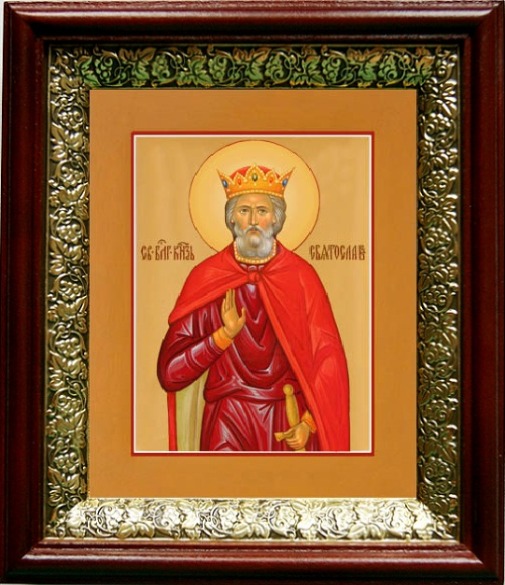 Икона святослав (19х22), темный киот. Лик нанесен методом шелкографии на цельную липовую доску, покрытую левкасом (специальным грунтом под живопись). Использованы минеральные (природные) краски. Размер иконы без киота (см): 13х16, с киотом: 19х22. Киот (рамка) выполнен из березы и украшен басмой (узор из черненой меди в виде виноградной лозы). Икона освящена.