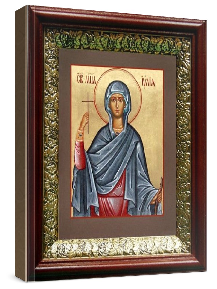 Икона юлия карфагенская (19х22), темный киот. Лик нанесен методом шелкографии на цельную липовую доску, покрытую левкасом (специальным грунтом под живопись). Использованы минеральные (природные) краски. Размер иконы без киота (см): 13х16, с киотом: 19х22. Киот (рамка) выполнен из березы и украшен басмой (узор из черненой меди в виде виноградной лозы). Икона освящена.