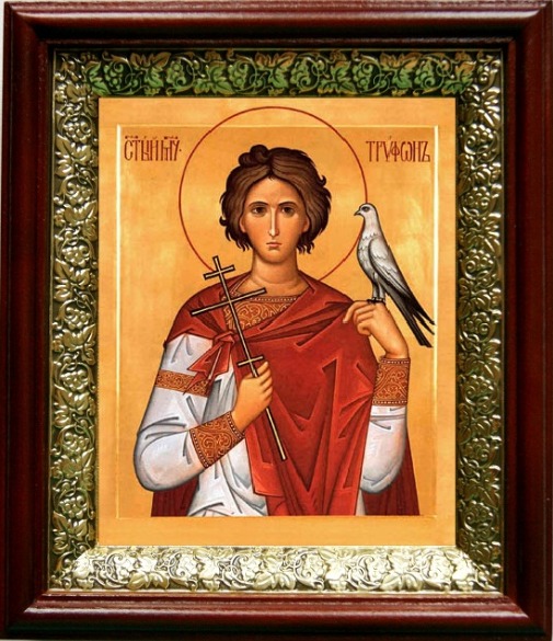 Икона трифон, мученик (19х22), темный киот. Лик нанесен методом шелкографии на цельную липовую доску, покрытую левкасом (специальным грунтом под живопись). Использованы минеральные (природные) краски. Размер иконы без киота (см): 13х16, с киотом: 19х22. Киот (рамка) выполнен из березы и украшен басмой (узор из черненой меди в виде виноградной лозы). Икона освящена.