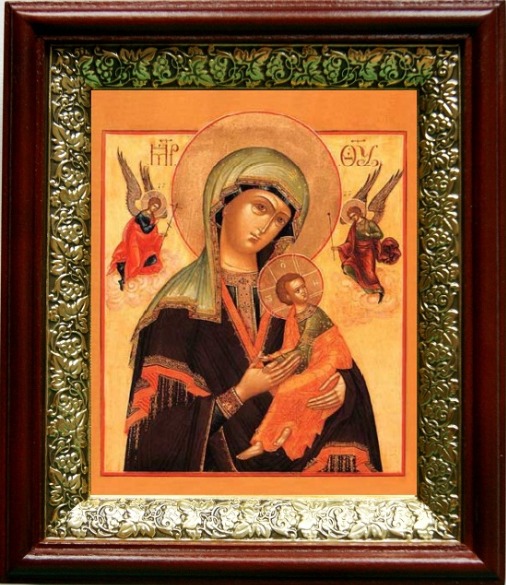 Страстная икона бм (19х22), темный киот. Лик нанесен методом шелкографии на цельную липовую доску, покрытую левкасом (специальным грунтом под живопись). Использованы минеральные (природные) краски. Размер иконы без киота (см): 13х16, с киотом: 19х22. Киот (рамка) выполнен из березы и украшен басмой (узор из черненой меди в виде виноградной лозы). Икона освящена.