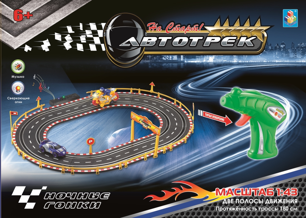 Автотрек с 2 машинками, 2 полосы движения, трасса 180 см, 34х24х5 см. Бренд: 1toy Описание: Автотрек Ночные гонки с 2 машинками, 2 полосы движения, трасса 180 см, размер коробки 34х24х5 см Вес: 0,819 Ширина: 4,5 Длина: 34,5 Высота: 24,5