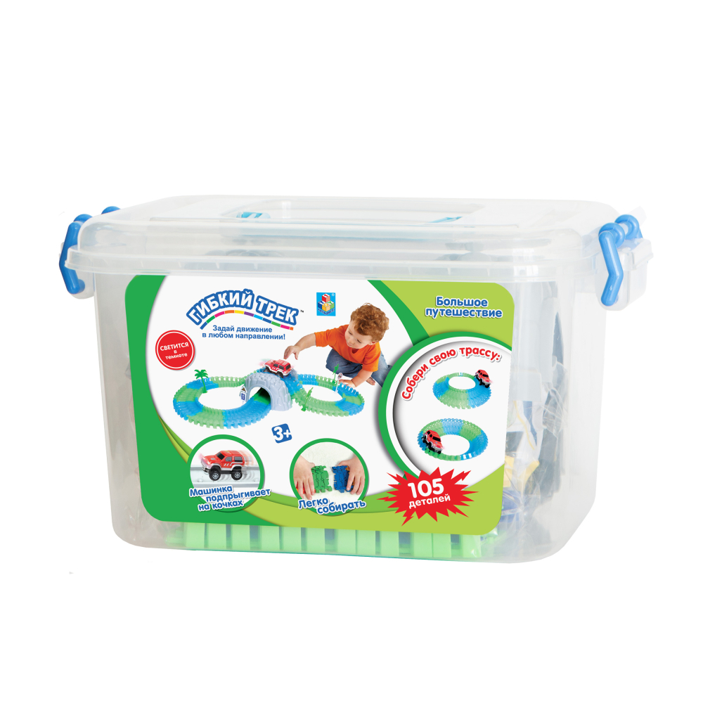 1toy гибкий трек большое пут-е 105 дет,пещера,машинка, светится в темноте,