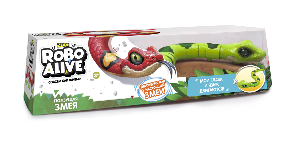 Игрушка робо-змея roboalive(зеленая), 2 *1,5vaaа бат (в компл не входят) . Бренд: ROBO ALIVE Описание: Новинка! Уникальные роботизированные змеи! Понаблюдай за дикой природой. За тем, как твоя змея ползет, перемещая свое тело и щелкая языком в поисках еды. При этом ее глаза двигаются так же, как и у настоящей змеи! Основные функции: движение глазных яблок, движение языка, быстрое реалистичное скольжение Вес: 0,318 Ширина: 40 Длина: 10 Высота: 13