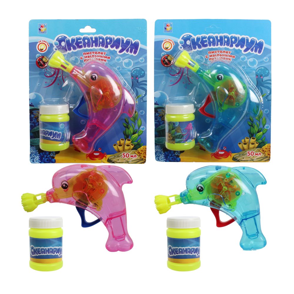 1toy океанариум, пистолет механич. с мыл. пузыр., в виде дельфина, со свет