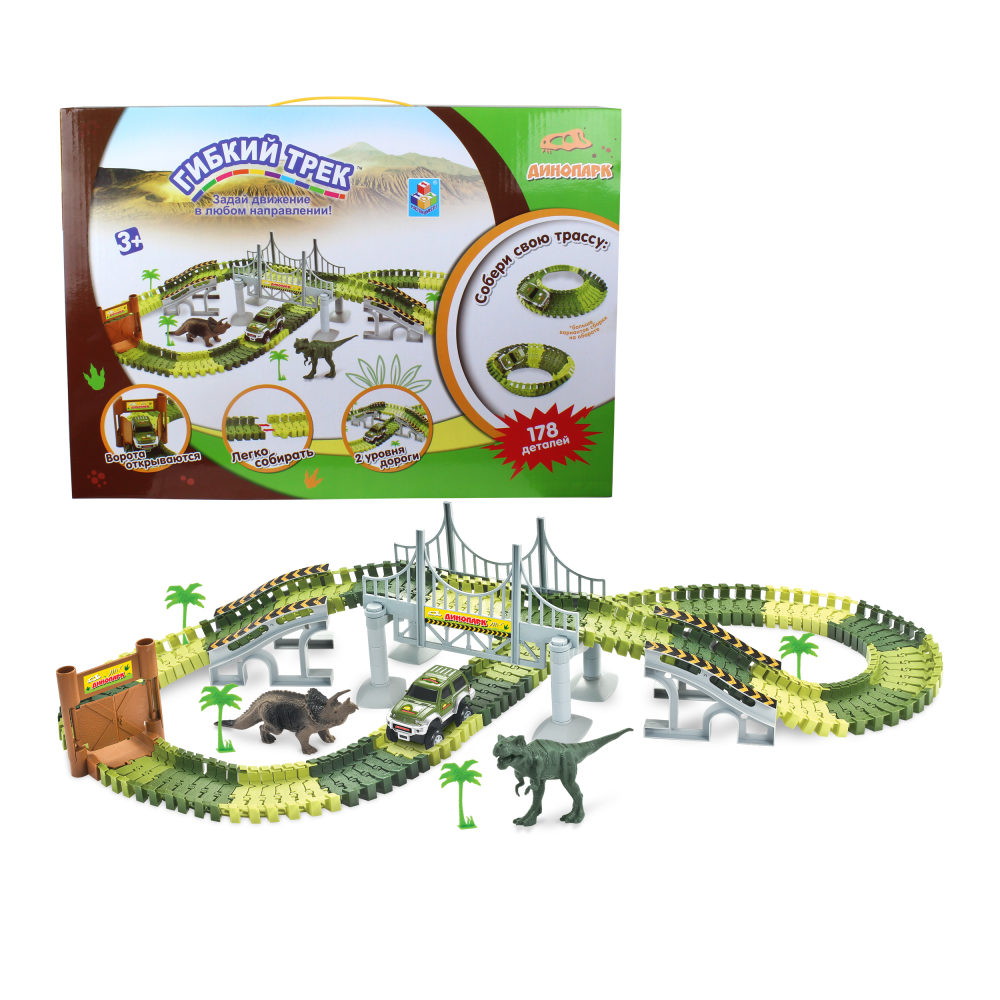 1toy гибкий трек динопарк, мост, ворота, 1 машинка, 178 дет