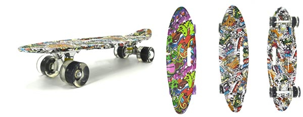 Описание: скейт подходит для детей от 5 до 12 лет. Платформа выполнена из пластика. Траки выполнены из легкого алюминия. Полиуретановые колеса со светом легко и быстро крутятся, что обеспечивает хорошую управляемость и скорость скейта. Диаметр колес: 60 мм. Ширина платформы: 17 см. Максимальная нагрузка на скейт 50 кг.