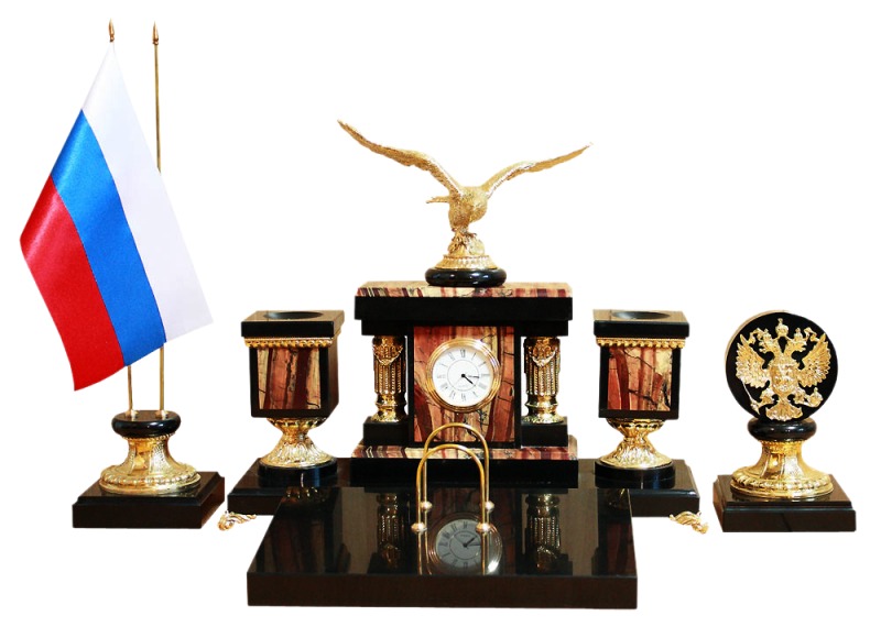 Письменный набор "орел" из яшмы. Материал: латунь, яшма, долерит. Покрытия: золотом 999,9; никелем. Техника исполнения: токарные и слесарные работы, художественное литье, рисовка кистью на металле,многоступенчатая гравировка иглой по лаку, травление, ручная подрезка, полировка. Письменный набор «Орел» - это эксклюзивные канцелярские принадлежности, выполненные вручную самыми лучшими мастерами и дизайнерами. Весь набор изготовлен латуни, яшмы и долерита, покрытый золотом и никелем. Такой подарок поистине займет достойное место на рабочем столе VIP-персоны. Он подчеркнет статус в обществе и станет предметом гордости среди коллег и конкурентов. Каждая деталь набора продуманна до мелочей, в чем и заключается его изысканность и роскошь. Размеры: Высота 340 мм. Длина 540 мм. Ширина 200 мм. Покрытие Гальванический метод