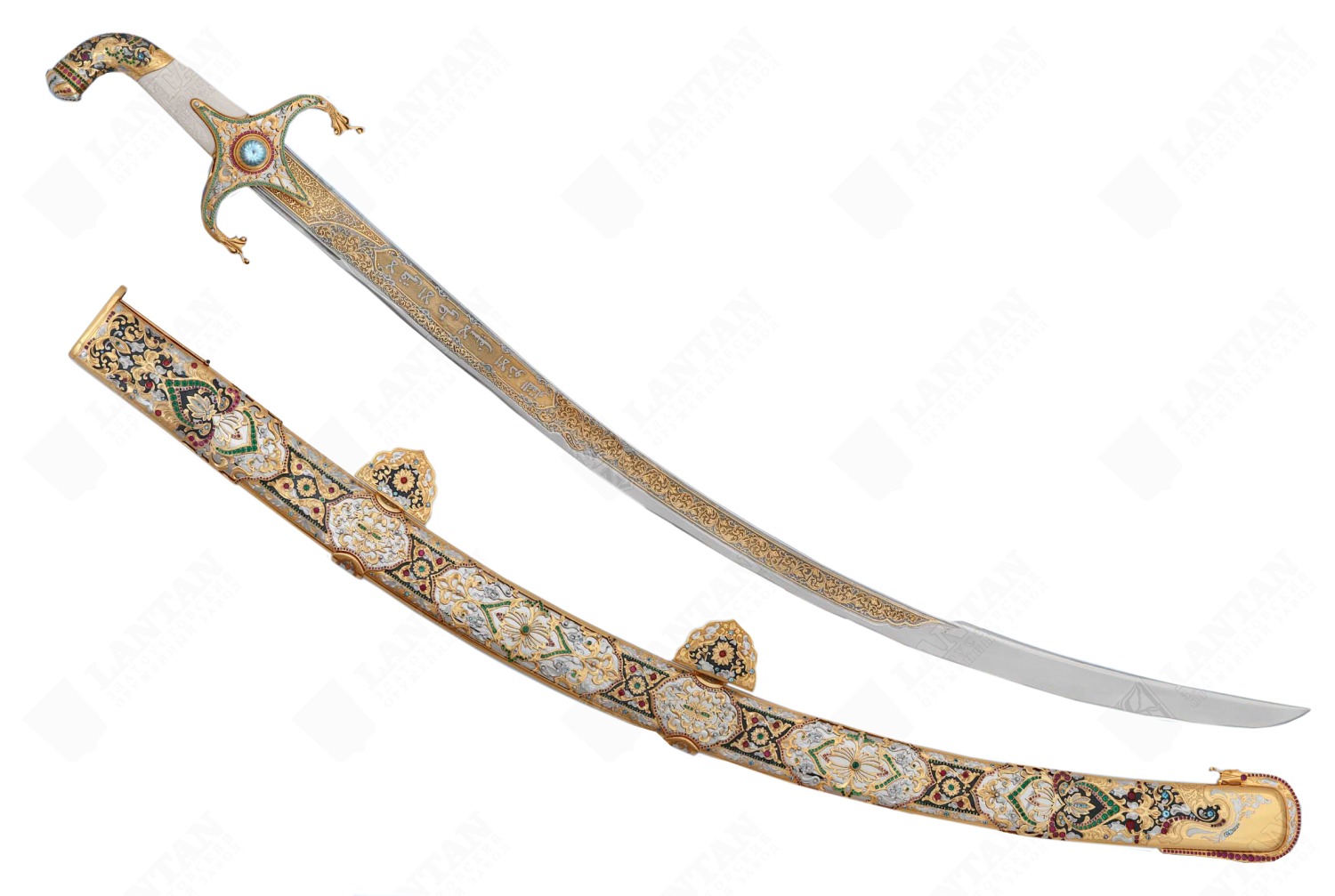 Сабля восточная из нержавеющей стали 40х10с2м(эи-107) златоуст. Материал: клинок из стали ЭИ-107 (закалка 55 ед. по шкале Роквелла); ножны из латуни; рукоять моржа кость; инкрустация ювелирными камнями. Покрытие: золотом 999,9; никелем. Техника исполнения: токарные и слесарные работы, рисовка кистью на металле, многоступенчатая гравировка иглой по лаку, травление, ручная подрезка, полировка, чернение латуни. Сабля "Восточная" будет отличным подарком для коллекционера оружия, родственника, друга, партнера по бизнесу, руководителя. Сабля - рубящее оружие с изогнутым клинком. Оно может быть и колющим, когда конец клинка оттачивается на десять сантиметров с обеих сторон. На Востоке же сабля получила распространение с VII века, да и на Руси известна исстари. "И ведает Печенежский князь претичю конь, саблю, стрелы", - сказано в летописи 968 года. Размеры: общая длина 1040 мм. длина клинка 850 мм. ширина клинка 33 мм. ? ×сталь Тип стали Кованая нержавеющая 40Х10С2М(ЭИ-107) Покрытие Гальванический метод