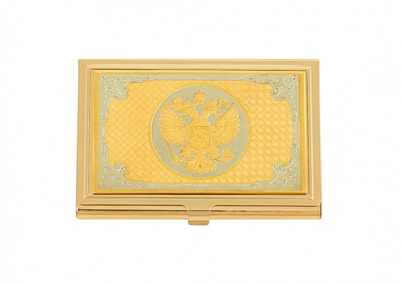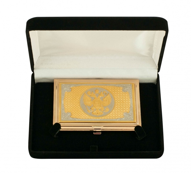 Визитница "герб россии" златоуст. Материал: латунь. Покрытие: золотом 999,9; никелем. Техника исполнения: токарные и слесарные работы, рисовка кистью на металле, многоступенчатая гравировка иглой по лаку, травление, ручная подрезка, полировка. Чтобы подчеркнуть высокий статус руководителя или сделать уникальный подарок деловому партнеру или коллеге по работе, стоит купить эксклюзивную визитницу «Герб России», изготовленную из латуни и покрытую золотом и никелем. Методом многоступенчатой гравировки на лицевую сторону изделия нанесено изображение герба нашей страны и сложный оригинальный узор. Размеры: длина - 9,5 см ширина - 6,3 см толщина - 0,8 см Покрытие Гальванический метод
