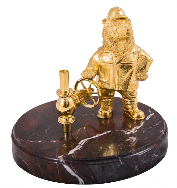 Сувенир "медведь - газовик" златоуст. Материал: латунь, яшма. Покрытие: золотом 999,9; никелем. Техника исполнения: токарные и слесарные работы, рисовка кистью на металле, многоступенчатая гравировка иглой по лаку, травление, ручная подрезка, полировка. «Медведь – газовик» имеет все шансы стать достойным корпоративным подарком для директора, руководителя соответствующей компании. Латунная фигура оформляется вручную, покрывается золотом и никелем, а после устанавливается на соответствующий концепции постамент из яшмы. Такой сувенир просто обязан быть размещен на виду!